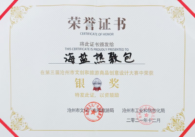 本次大賽是由滄州市文化廣電和旅游局、滄州市工業(yè)和信息化局聯(lián)合舉辦。在歷時6個月的比賽中,“滄鹽”牌海鹽熱敷包(宮廷款)最終脫穎而出,代表渤海新區(qū)進入決賽,并經(jīng)過決賽路演、專家評審榮獲銀獎。此獎項也是渤海新區(qū)參賽商品中的最高獎項。