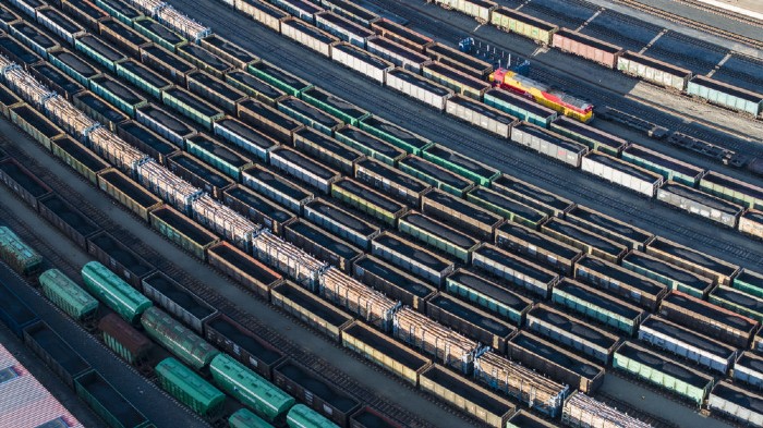 2025年10月18日,在中國(guó)鐵路哈爾濱局集團(tuán)有限公司綏芬河站南場(chǎng),滿載進(jìn)口貨物的列車等待解體換裝(無(wú)人機(jī)照片)。