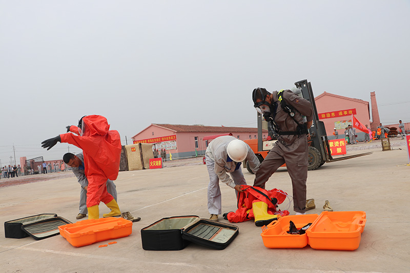 本次參加實戰(zhàn)演練的隊員40余人。活動模擬了機(jī)械傷害、中暑、觸電、火災(zāi)、溴素燙傷、氯氣泄露等6個事故場景。在應(yīng)急救援指揮部的統(tǒng)一指揮下和各應(yīng)急救援隊員的準(zhǔn)確處置下,人員得到了有效疏散,傷員得到了及時救助,事故得到有效控制,全面檢驗了指揮調(diào)度效率和救援隊伍的應(yīng)急實戰(zhàn)水平,確保了遇到突發(fā)事件能“拉得出、攻得上、打得贏”。演練同時還進(jìn)行了消防技能、空呼機(jī)穿戴、防化服穿戴、空呼機(jī)穿戴30米跑等比武活動。