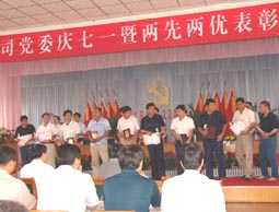 大會在雄壯的國歌聲中開始。公司黨委委員、總經(jīng)理姬洪利同志宣讀了公司黨委《關(guān)于表彰2007年度暨2008年“爭先創(chuàng)優(yōu)”活動先進集體和優(yōu)秀個人的決定》。在工作人員宣讀完受表彰的先進集體和優(yōu)秀個人名單后,大會對在2007年度為企業(yè)發(fā)展和進步做出突出貢獻的7個先進基層黨組織和2個黨風廉政建設先進黨總支、支部及2008年“爭先創(chuàng)優(yōu)”競賽活動涌現(xiàn)出的5個優(yōu)勝黨總支、支部和10名模范黨員頒發(fā)了獎牌和獎杯。王德華、文興峰、姚金崗三名同志分別代表先進基層黨組織、優(yōu)秀共產(chǎn)黨員、和“爭先創(chuàng)優(yōu)”模范黨員做了表態(tài)發(fā)言。