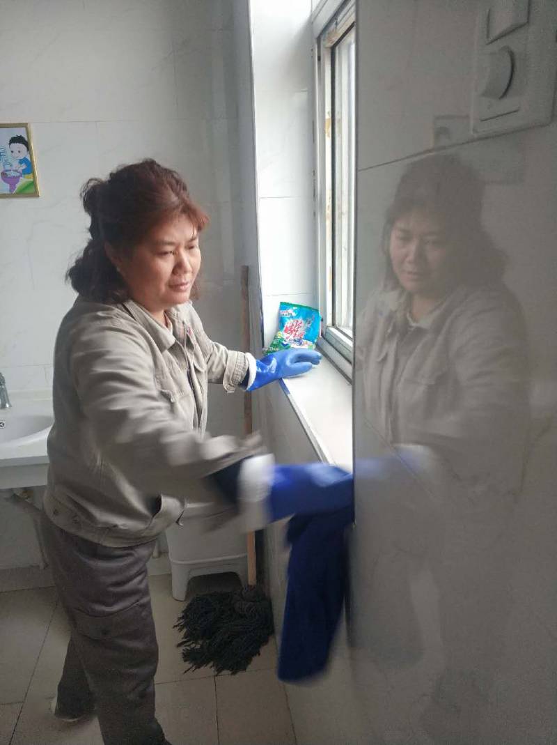 在職工陸續(xù)上崗時(shí),她又拿起笤帚打掃起宿舍、走廊來(lái),并用投洗了幾遍的墩布,仔細(xì)地擦拭著房間里的犄角旮旯,直到地面上“照出人影來(lái)”才肯罷休。來(lái)不及歇息,她又緊接著趕赴下一個(gè)“戰(zhàn)場(chǎng)”——衛(wèi)生間。通風(fēng)、沖洗、消毒、清掃、擦拭、晾曬、整理,這一整套工作她只用30多分鐘就搞定了。