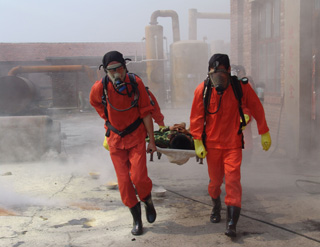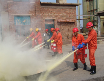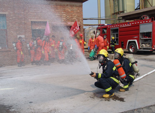 在模擬火災(zāi)現(xiàn)場(chǎng),救援車輛滿載救援隊(duì)員及搶救器材、物資在第一時(shí)間進(jìn)入現(xiàn)場(chǎng),救援人員使用干粉滅火器,對(duì)準(zhǔn)火源,迅速將火撲滅。與此同時(shí),在模擬液氯鋼瓶泄漏救援演練現(xiàn)場(chǎng),液氯鋼瓶發(fā)生泄漏,救援人員一面組織現(xiàn)場(chǎng)人員用濕毛巾捂住口,向上風(fēng)口方向緊急疏散;一面佩戴專業(yè)空氣呼吸器,身著防化服,用液氯捕消器對(duì)泄漏源實(shí)施氯氣捕消和封堵,并將封堵后的鋼瓶由叉車送到液堿池進(jìn)行中和處理。在救援過程中,現(xiàn)場(chǎng)有一人氯氣中毒,現(xiàn)場(chǎng)總指揮立即派出4名救援隊(duì)員用擔(dān)架將傷員移至安全地帶,并同時(shí)向醫(yī)療急救中心和消防大隊(duì)請(qǐng)求救援。隨后,救護(hù)車、消防車先后趕到,醫(yī)護(hù)人員迅速對(duì)受傷人員實(shí)施搶救,消防人員則馬上啟動(dòng)消防設(shè)施,進(jìn)行水霧空中噴灑,將空氣中的氯氣吸附,控制事故范圍。事故處理完畢后,經(jīng)現(xiàn)場(chǎng)毒氣檢測(cè),空氣中氯氣含量降至安全水平。至此,2010年中鹽長蘆滄州鹽化集團(tuán)有限公司危險(xiǎn)化學(xué)品及消防應(yīng)急救援演練順利結(jié)束。