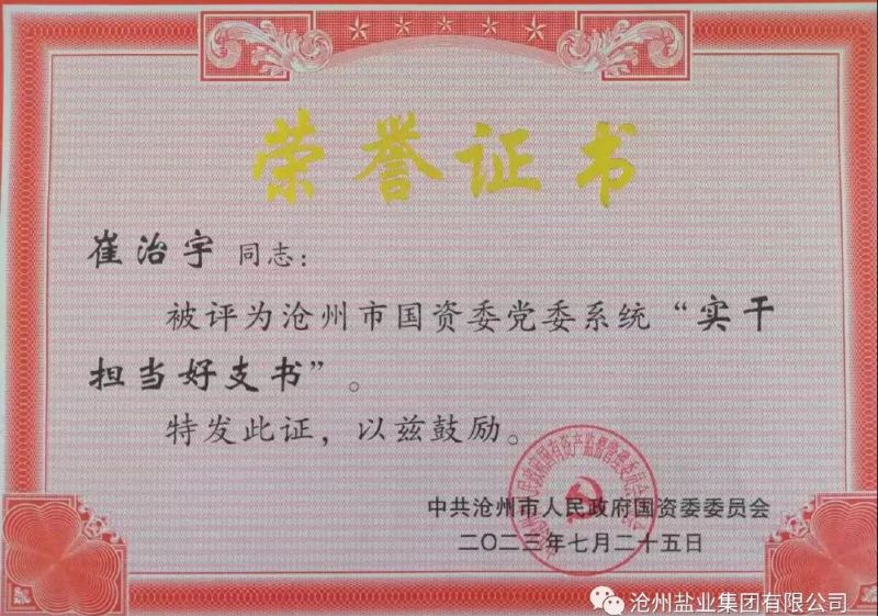 近日,我公司基層黨組織書記趙長(zhǎng)利、崔治宇被中共滄州市人民政府國(guó)資委委員會(huì)授予“實(shí)干擔(dān)當(dāng)好支書”稱號(hào),并受到表彰。