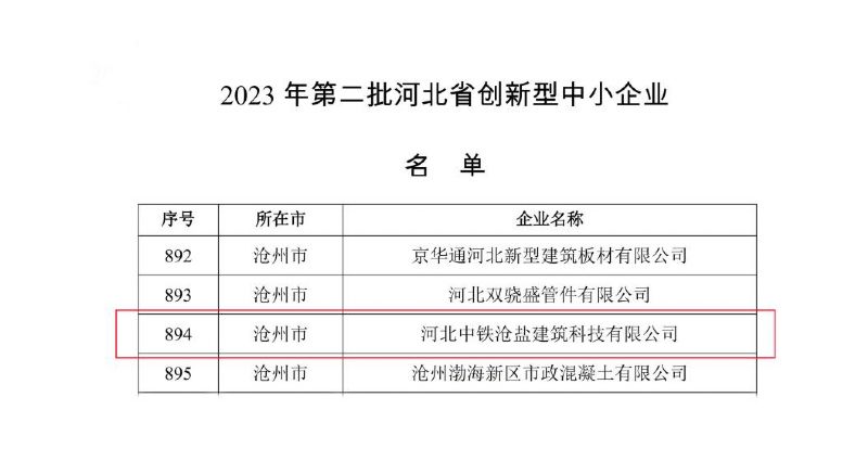 近日,河北中鐵滄鹽建筑科技有限公司獲評河北省2023年“創(chuàng)新型中小企業(yè)”榮譽稱號。