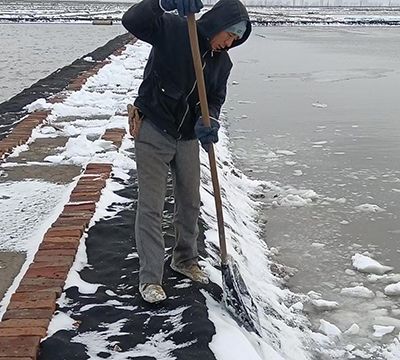 長蘆公司安排各單位清除門前、道路、生活區(qū)積雪。一線各單元及時清除塑苫積雪,用適當濃度鹵水對趕鹵池進行灌池化雪和串壕化雪。