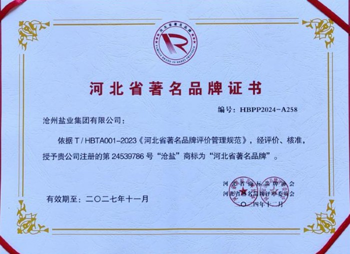 近日,河北省商標(biāo)品牌協(xié)會(huì)組織開(kāi)展的2024年度“河北省著名、知名、優(yōu)秀品牌”評(píng)選結(jié)果正式揭曉,經(jīng)過(guò)嚴(yán)格的評(píng)審和篩選,滄州鹽業(yè)集團(tuán)有限公司注冊(cè)號(hào)為24539786的“滄鹽”牌商標(biāo)被評(píng)定為“河北省著名品牌”,滄州鹽業(yè)集團(tuán)有限公司被授予“河北省商標(biāo)品牌協(xié)會(huì)副會(huì)長(zhǎng)單位”。