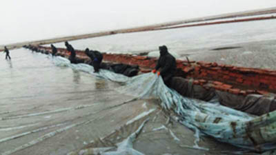 22日上午,副總經(jīng)理李蜻海根據(jù)大雪漸弱、溫度繼續(xù)下降、風力再度加強的天氣實況,緊急組織召開會議,果斷決策:一是根據(jù)后步大風降溫的趨勢,今日寒流前全部回收塑苫。二是回收過程中塑膜淡水要片凈,操作要嚴細,確保塑膜完好。三是生產(chǎn)部、制鹽場各級管理人員要做好現(xiàn)場的指揮檢查。在收塑過程中,全體職工嚴細把握每一步操作要領(lǐng),在冰冷刺骨的鹵水中,手倒、木杠撬,防止人為造成塑膜損傷,至下午3時,終于使全公司塑苫池完整回位,并及時用人工的方式對塑苫上的冰塊進行了清除,全部進行了苫封,做好防風防凍措施。