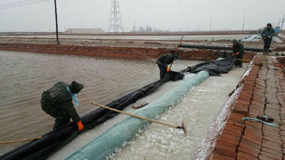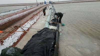 20日上午,各生產(chǎn)單元利用氣溫較高時段對全公司3.3萬多公畝塑苫池和1200余公畝保鹵圈全部進行了苫蓋,并重點做好防風措施。20日晚,氣溫驟降,風雨交加,副總經(jīng)理李蜻海及生產(chǎn)部、各制鹽場班子成員多次往返于受災(zāi)現(xiàn)場,查看災(zāi)情,制定相應(yīng)的生產(chǎn)措施。一線職工顧不得天寒地滑,頂風冒雨堅守在灘田,及時片淡排淡,巡邏防風,排除了一個又一個險情。21日夜間,狂嘯的大風夾裹著雪花肆虐而至,最大風力達到了7到8級,為確保措施萬無一失,各制鹽場采取定人定池的方法堅守在塑苫池旁巡視值班。職工們頂著-1℃的低溫,認真檢查、封壓塑苫,有的職工衣服淋透結(jié)了冰,凍得瑟瑟發(fā)抖,但沒有一個退縮;有的手指失去了知覺,就哈哈氣、搓搓手接著干,此時此刻,職工們拼的不僅僅是體力,拼的更是毅力和決心。在職工們的共同努力下,保證了全公司塑膜無一處因大風損壞而損失鹽鹵。